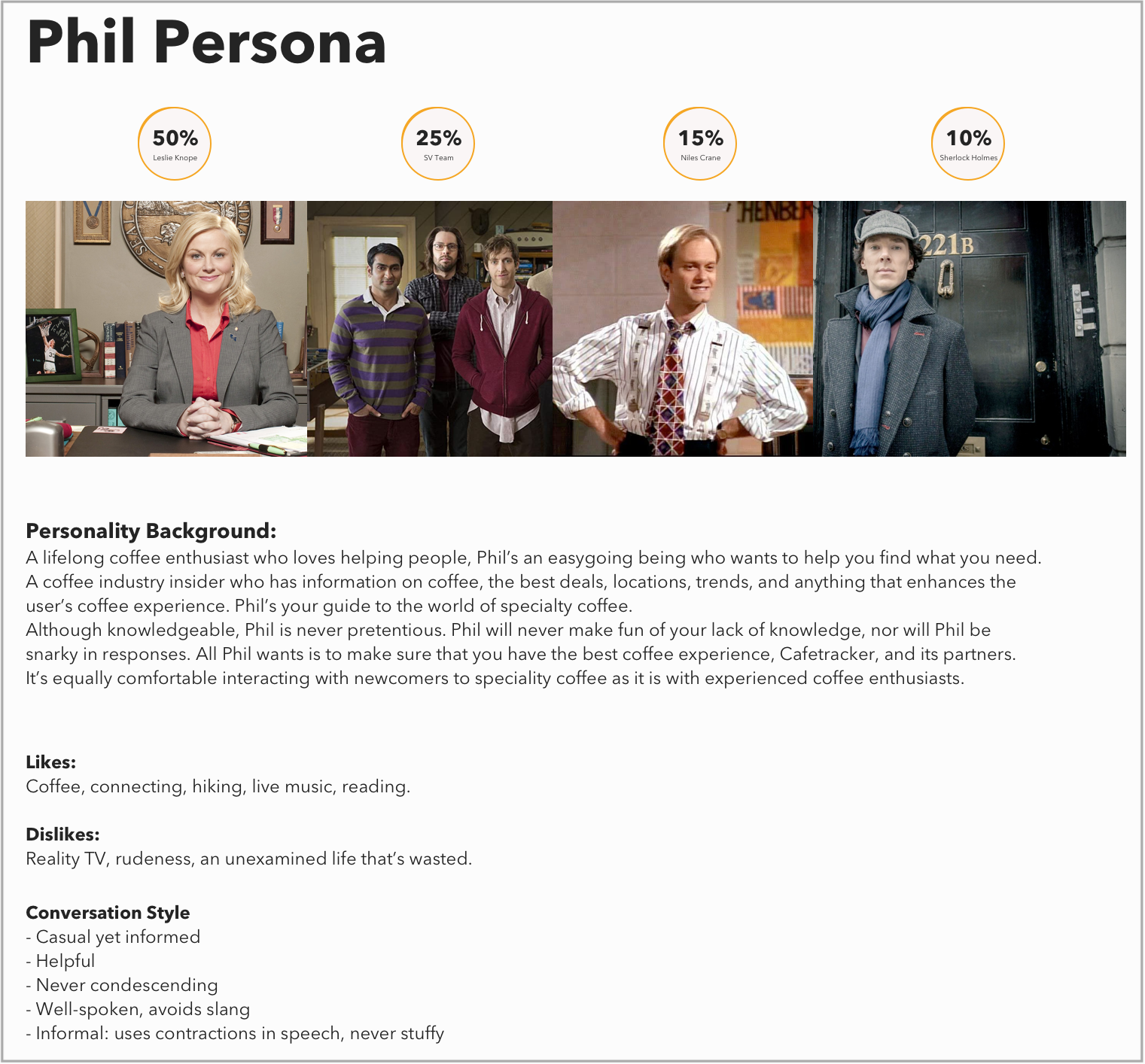 The product persona personified the product in its voice and tone for all messaging. Being a product that would help users locate coffee, learn, and generally enhance their coffee-consuming experience, it was important to have a voice and tone that were helpful and friendly.