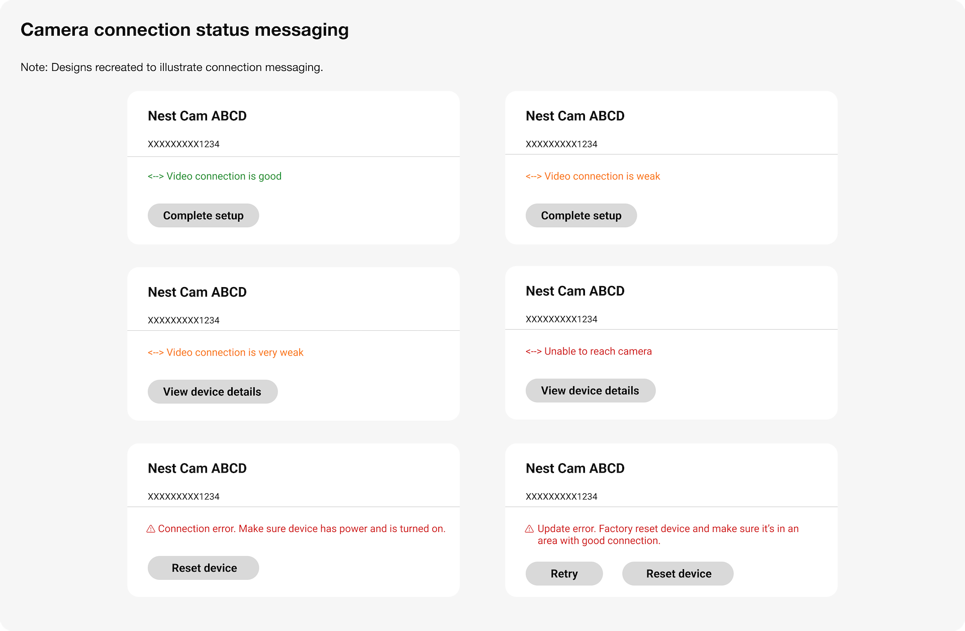 I created status messages (both happy path and error states), taking into account all the states a camera could be in. The following is a sample of the many states the tech could see in the course of setting up cameras.