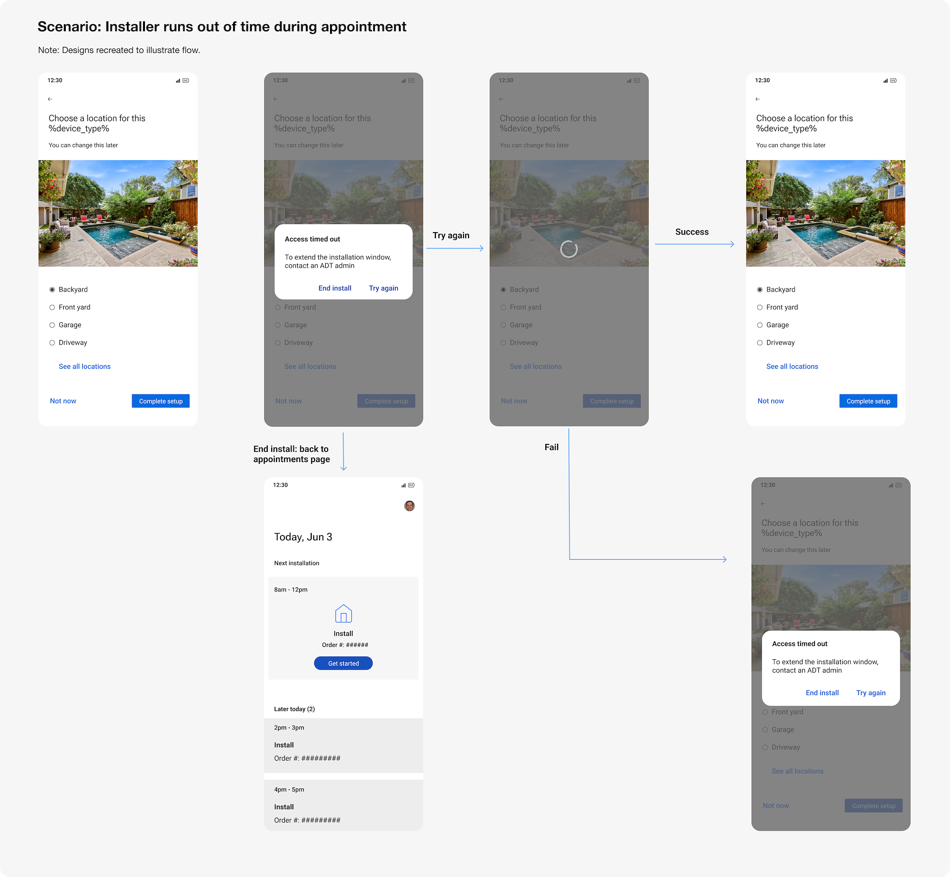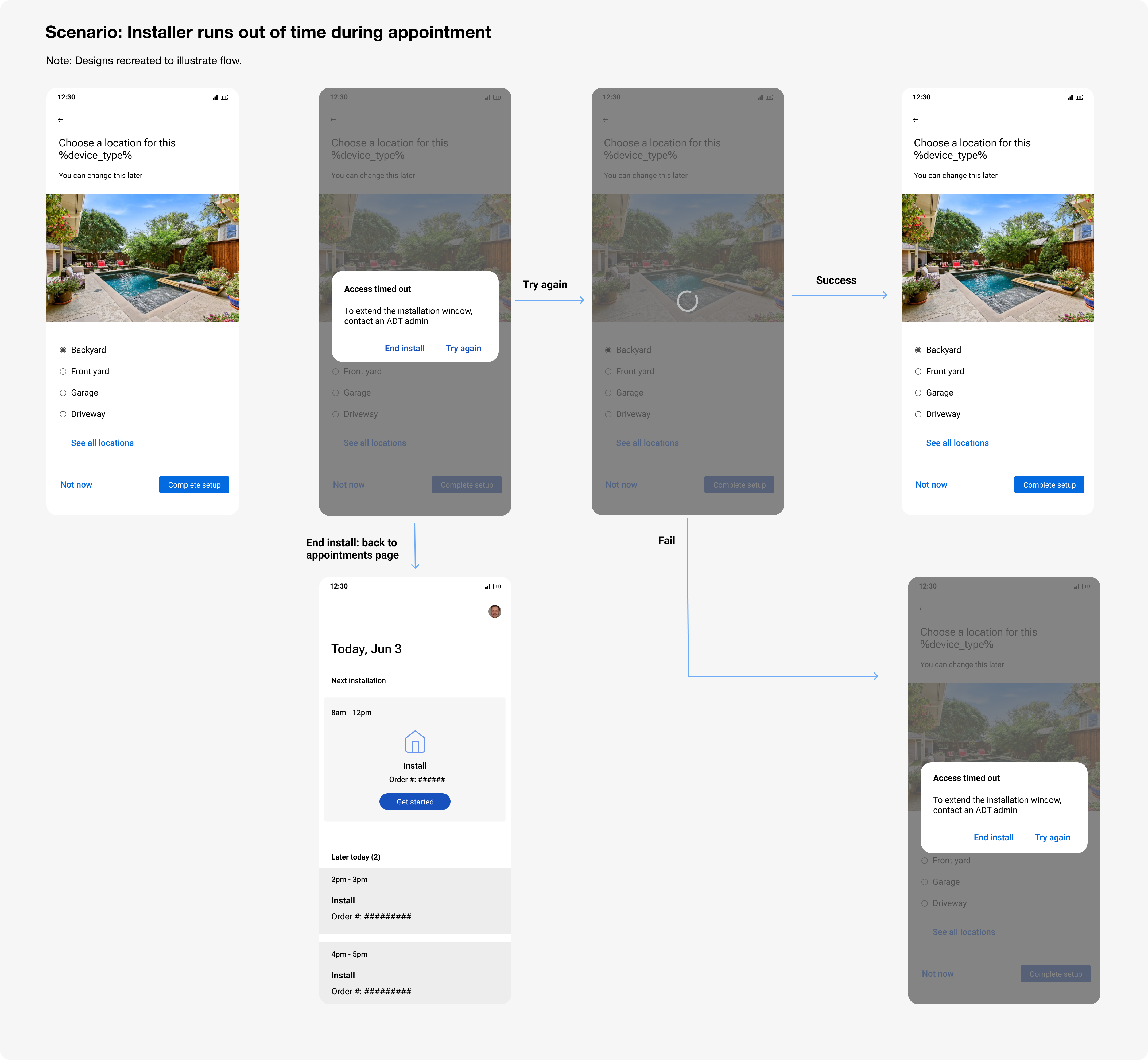 The app would automatically end the appointment at the scheduled time, and the tech would need to get in touch with ADT to extend the appointment end time. We needed to communicate this to the tech, and also give them a recovery method (i.e., contact ADT).