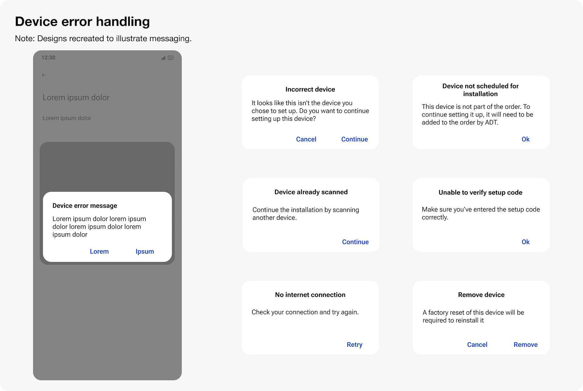 Each scenario required a unique error message, and the message needed to be precise and helpful. A generic “something’s wrong with the device being installed” would not work. To make sure that the user was well informed, I created unique messages for the error states listed above, as well as for other errors.