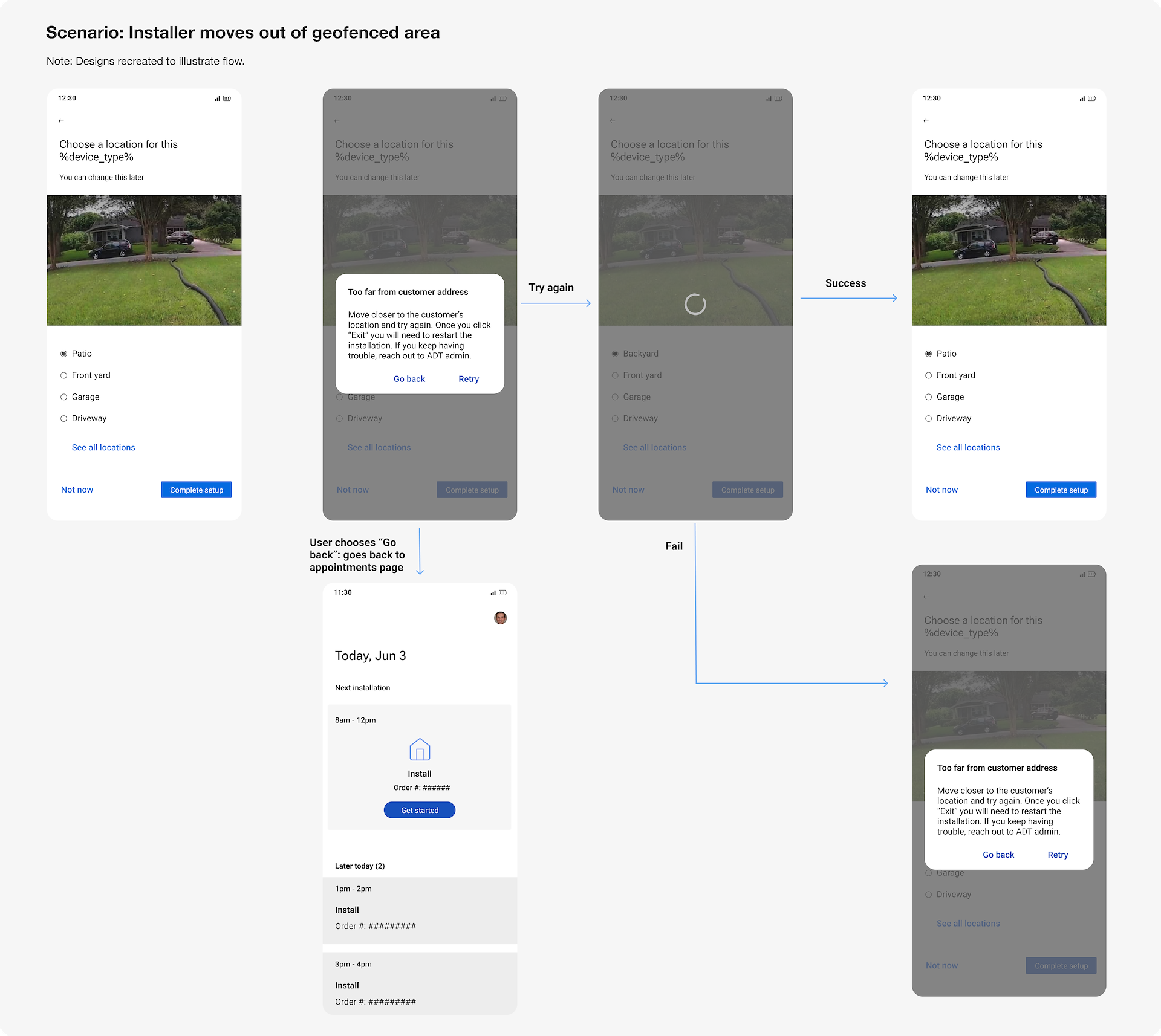 Each customer appointment address had a geofence included in it that the tech was required to be within to successfully perform the installation. Due to the existence of the geofence, there needed to be messaging for when, whether voluntary or due to technical errors, the tech was considered to be outside of the geofence.