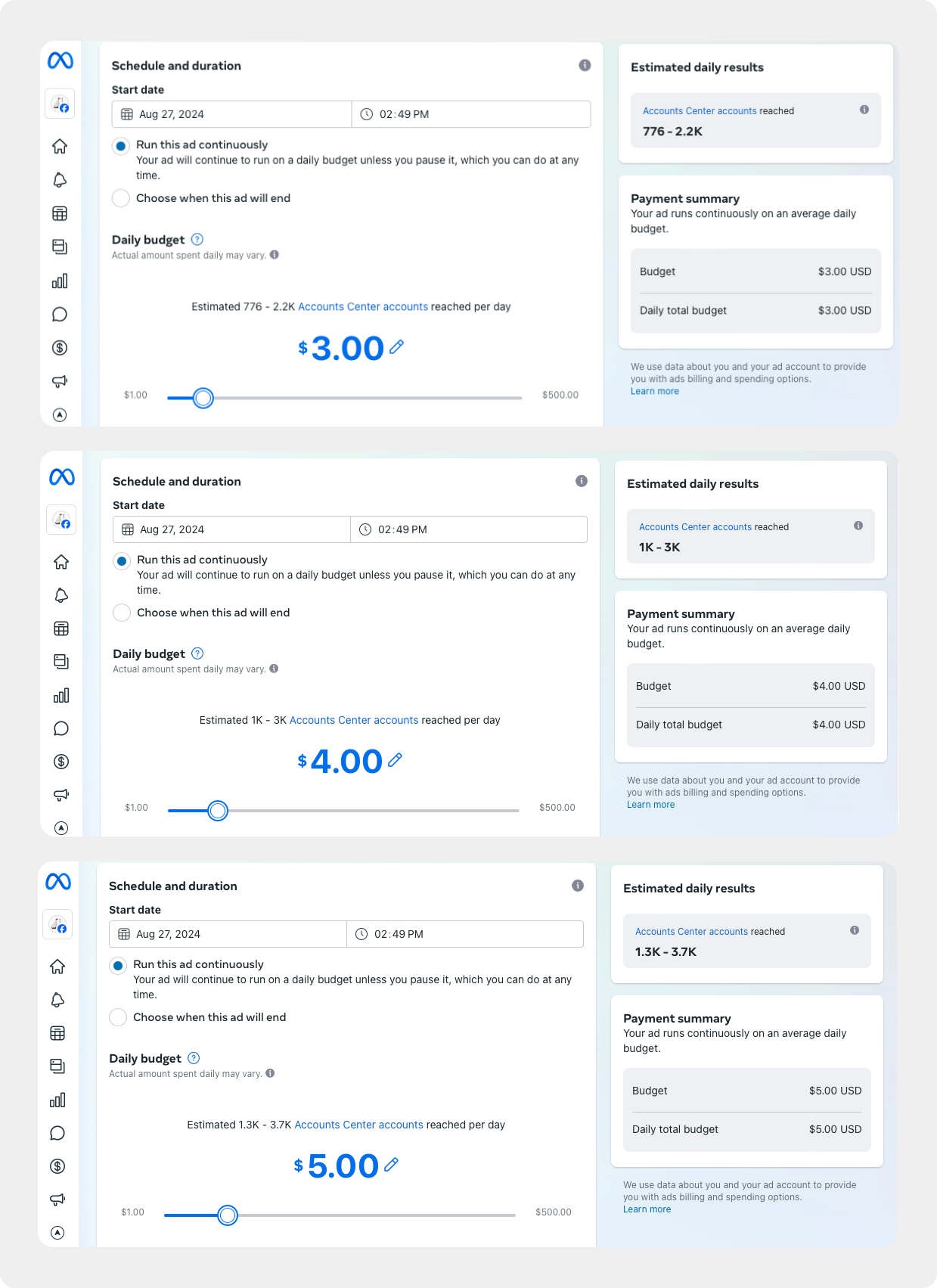 I took on all product design duties for this feature. Our users needed to see for themselves how a little could go a long way in their ad spend. The ad creation page with the budget section in it was already text-heavy, so forcing users to plug in different amounts to see how many people they could reach would be a poor experience.